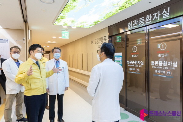 | ▲ 7일 오후 오병권 행정1부지사가 부천시 중동에 위치한 순천향대학교 부천병원을 찾아 코로나19 전담병상 운영 등 현장을 살펴보고 있다.(사진=경기도) |