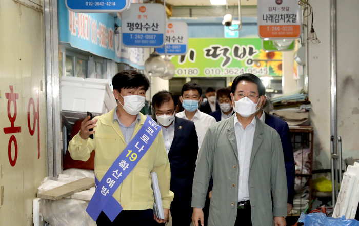 김 지사의 이번 방문은 코로나19 확산에 따른 지역 감염 확산으로 불안감이 높아진 가운데 시장을 찾는 이용객 감소로 힘들어하는 상인들의 애로사항을 듣고, 격려하기 위해 마련됐다.