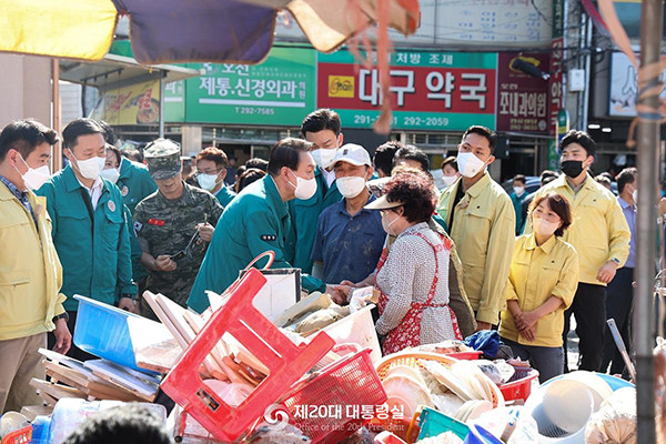 ▲ 윤 대통령이 7일 오후 제11호 태풍 힌남노로 피해를 입은 경북 포항시 남구 오천시장을 방문, 피해 물품을 살피며 상인들을 위로하고 있다. (사진=대통령실) |