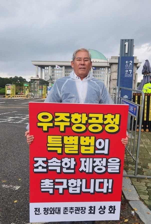 이에 따라 최상화 전 청와대 춘추관장은 ‘우주항공청 특별법의 조속한 제정을 촉구합니다’는 피켓을 들고 1인 시위에 나서 국회의 우주항공청 특별법 통과를 촉구했다.