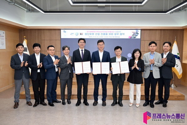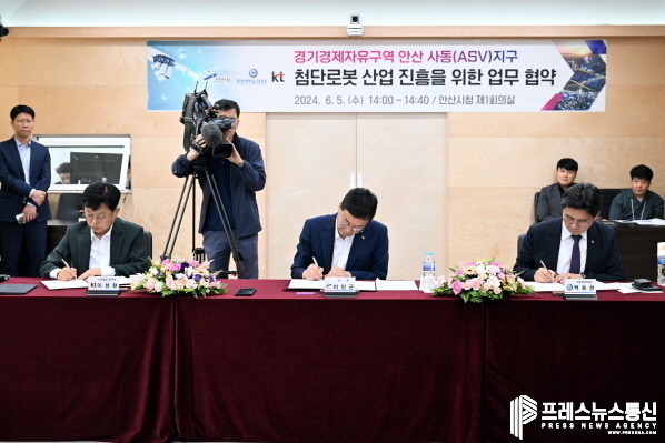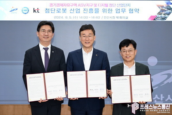 안산시(시장 이민근)는 5일 오후 안산시청 제1회의실에서 KT(대표이사 김영섭), 한양대학교 ERICA(총장 이기정)와 함께 ‘경기경제자유구역 안산사이언스밸리 및 디지털 첨단산업단지의 ‘첨단로봇 산업 진흥’을 위한 공동 업무협약을 체결했다고 밝혔다.