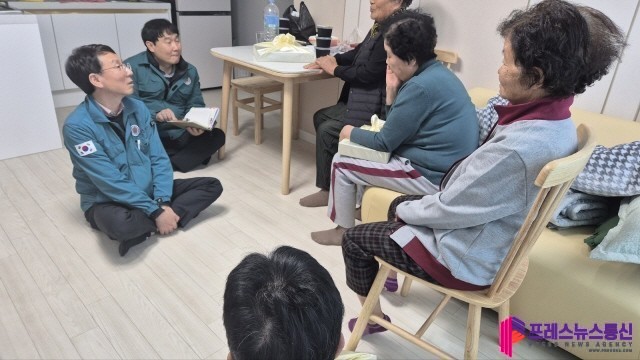 | ▲김성중 경기도 행정1부지사가 30일 광명시를 찾아 붕괴 위험이 있는 비닐하우스 등을 살펴본 후 시에서 마련한 안전 주택에 대피 중인 이재민들을 격려하고 있다.(사진=경기도) |