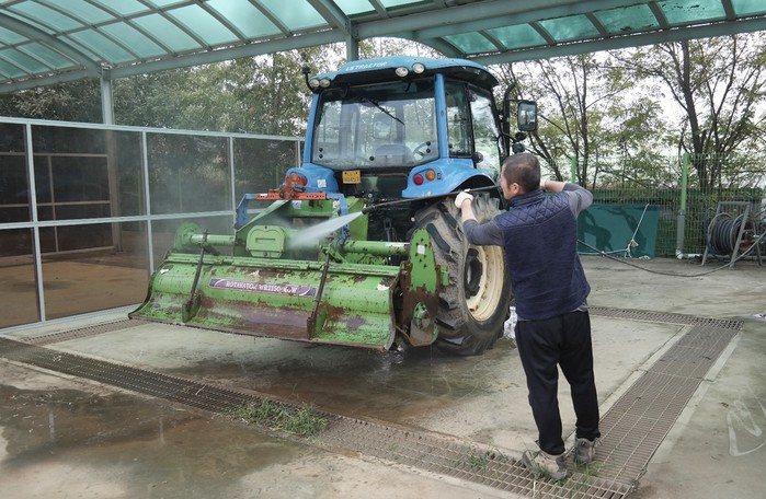 세차장에는 농기계 흙과 오물을 쉽게 세척할 수 있는 고압세척기와 세차에 따른 오염수를 정화할 수 있는 오폐수 정화 시설을 갖추고 있다.