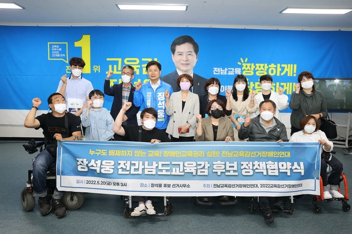 ‘전남교육감선거장애인연대’는 20일 장석웅 선거사무소에서 정책협약을 맺었다. ‘전남교육감선거장애인연대’ 관계자는 “지난 4년 동안 장석웅 교육감은 장애인 교육권을 보장하기 위해 노력해 왔고, 장애인들에게 교육의 미래가 있음을 보여줬다”며 “협력과 공생을 통해 장애인의 교육받을 권리가 보장되는 전남교육을 만들어온 장석웅 후보를 지지한다”고 밝혔다.