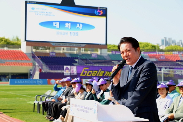 | ▲최대호 안양시장이 지난 13일 안양종합운동장에서 열린 ‘2024 시장기(배) 종목별 체육대회 통합개회식 및 제70회 경기도체육대회 출정식’에서 대회사를 하고 있다.(사진=안양시) |