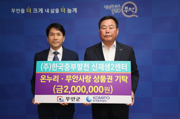 [전남=프레스뉴스] 강래성 기자= 전남 무안군(군수 김산)과 ㈜한국중부발전 신재생2센터(본부 미래사업단장 김동준)는 17일 저소득층 지원 상품권 기탁식을 진행했다.