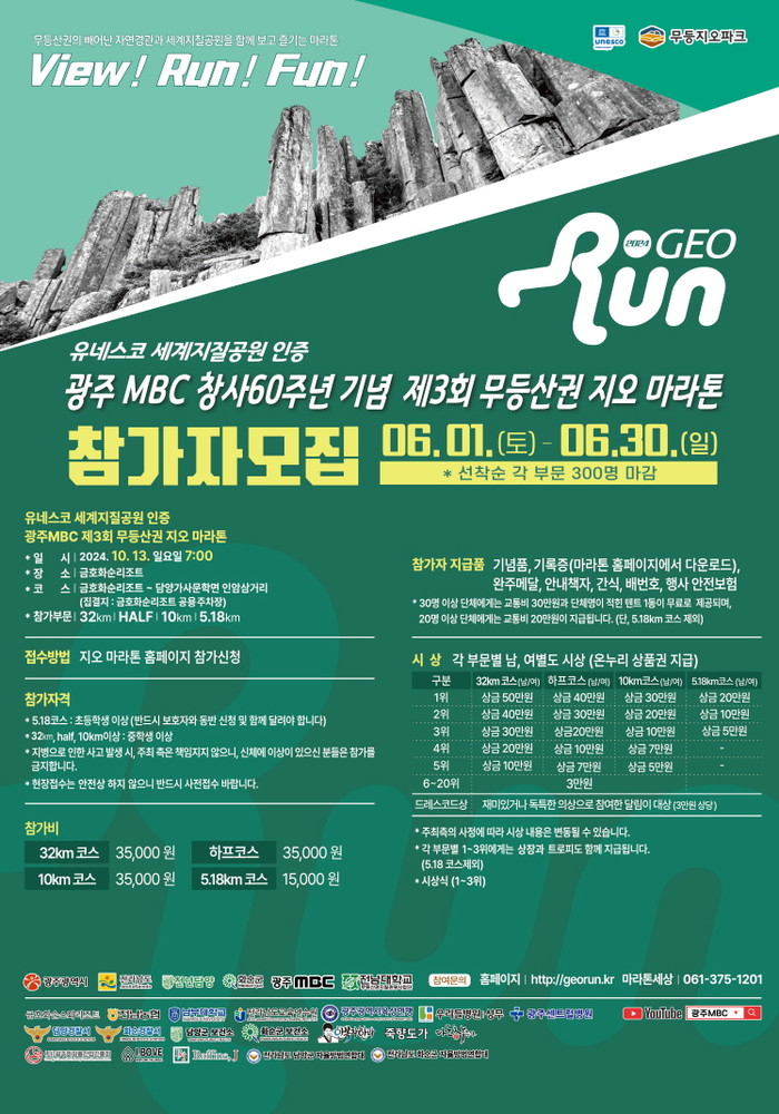 오는 10월 13일 담양군과 전라남도, 화순군, 광주광역시, 광주문화방송의 주최로 열리는 이번 지오마라톤 대회는 ‘자연을 달리다’를 주제로 무등산권 유네스코 세계지질공원의 다채로운 자연을 감상할 수 있는 코스로 구성했다.