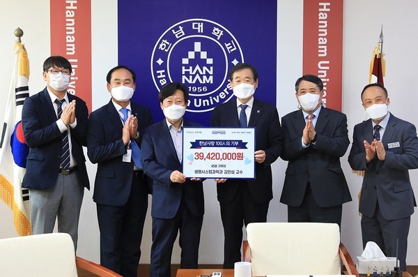 3일 한남대에 따르면, 김 교수는 본관 2층 총장실을 방문해 이광섭 총장에게 대학발전기금 3942만 원을 전달했다.