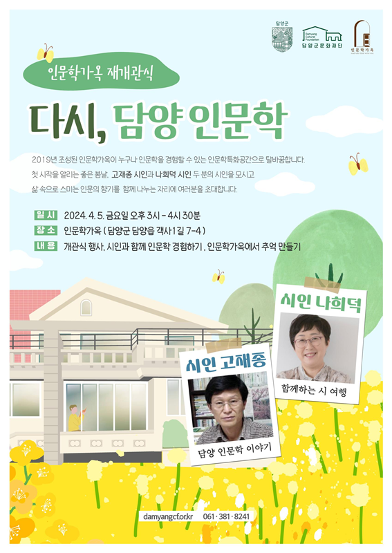 인문학가옥 재개관식 행사에서는 나희덕 시인과 함께하는 시 여행, 송순문학상 수상자인 고재종 시인이 들려주는 담양 인문학 이야기 등 인문학의 정취를 느낄 수 있는 프로그램들이 진행될 예정이다.