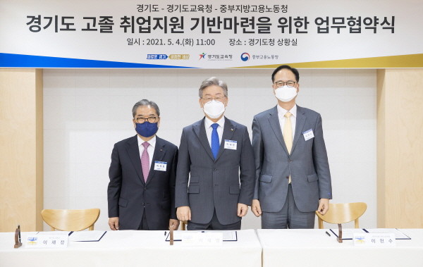 이재명 경기도지사는 4일 경기도청에서 이재정 경기도교육감, 이헌수 중부지방고용노동청장과 이 같은 내용의 업무협약을 체결했다. 이번 협약은 기관 정보교류와 네트워크를 통해 고등학교 졸업생을 위한 각 기관 간 취업지원 정책의 연속성을 확보해 효율적인 취업 지원을 하기 위해 이뤄졌다.