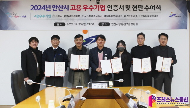 [프레스뉴스] 장현준 기자= 안산시(시장 이민근)는 지난 23일 ㈜프리뉴 등 관내 6개 기업에 대해 고용 우수기업으로 선정하고 인증서와 현판을 수여했다고 24일 밝혔다.
