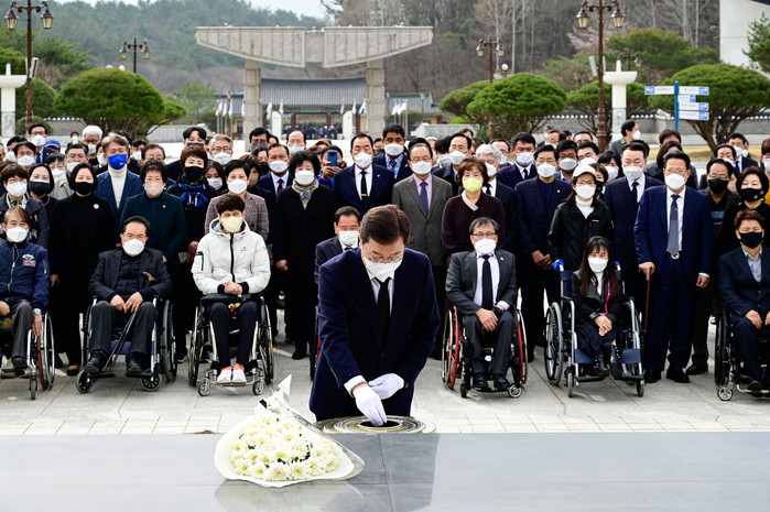 이용섭 예비후보는 방명록에 “오월정신이 살아 숨쉬는 더 크고 더 강한, 사람의 나라 광주를 완성하여 정권교체의 주역이 되고 새로운 미래 100년을 열겠다”고 남기고, 필승의 각오를 다졌다.