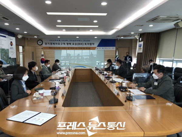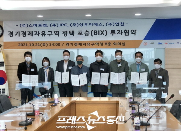경기경제청은 21일 오후 2시 평택항 마린센터 8층 회의실에서 (주)스마트켐, (주)JPC, ㈜성우이에스, ㈜인찬 등 소·부·장 기업 4곳, 평택시와 ‘평택 포승(BIX)지구 산업시설 용지 입주를 위한 투자협약’을 체결했다.