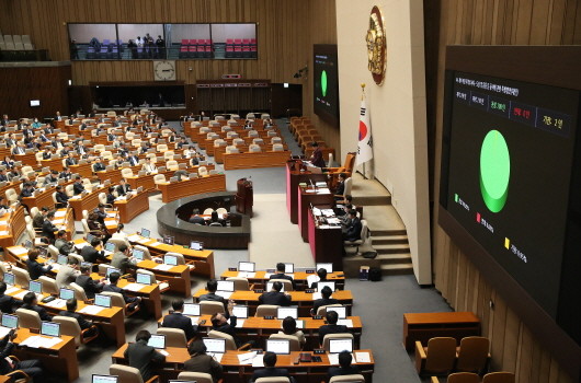 | ▲9일 오후 국회 본회의장에서 열린 제411회국회(임시회) 제4차 본회의에서 개의 식용 목적의 사육ㆍ도살 및 유통 등 종식에 관한 특별법안(대안)이 가결되고 있다.(사진= 뉴스1) |