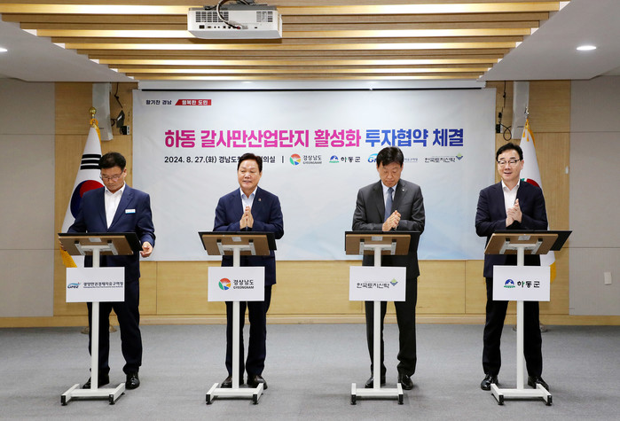 | ▲ 하동군은 지난 27일 경상남도청 도정회의실에서 ‘하동지구 갈사만 산업단지 개발사업’ 추진을 위한 투자협약을 체결했다고 밝혔다 (사진=하동군) |