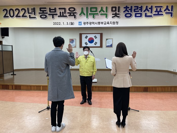 [광주=프레스뉴스] 강래성 기자= 광주동부교육지원청이 3일 임인년 새해를 맞아 대회의실에서 코로나19 상황임에도 청렴은 계속돼야 한다는 의지의 일환으로 ‘2022 동부교육 시무식 및 청렴선포식’을 개최했다.