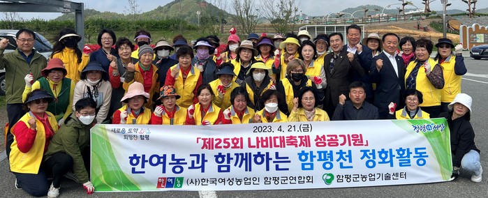 여성농업인 40여 명은 나비대축제 기간 함평을 찾은 관광객들에게 쾌적한 관광환경을 제공하기 위해 함평교에서 함평천까지의 꽃길 조성 구역을 돌며 환경 정화활동을 펼쳤다.