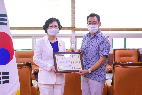 ▲ 안산시의회가 11일 의장실에서 광복회 안산시지회 회원이자 독립유공자 후손인 임채정 님에게 애국 정신을 고양한 공로로 표창장을 수여했다. 사진 왼쪽이 박은경 의장, 오른쪽이 임채정 님의 모습.(사진=안산시의회) |
