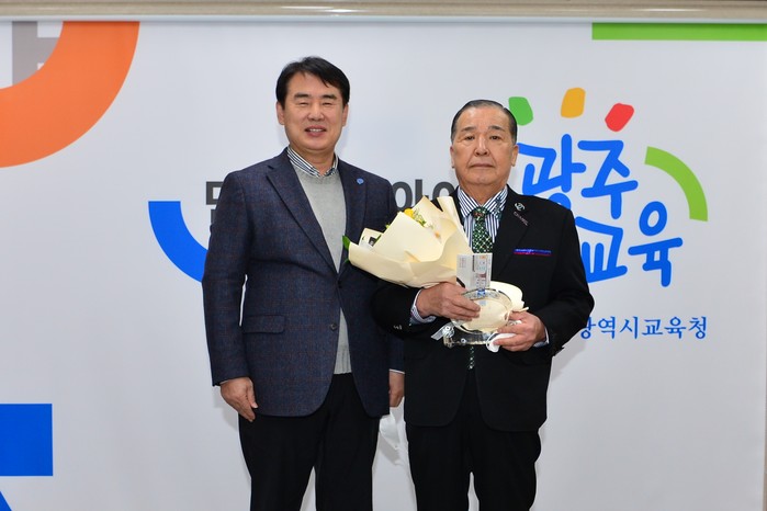[광주=프레스뉴스] 강래성 기자= 이정선 교육감은 27일 교육감실에서 퇴직 원로 직원 김종석(70) 씨에게 감사패를 수여했다.