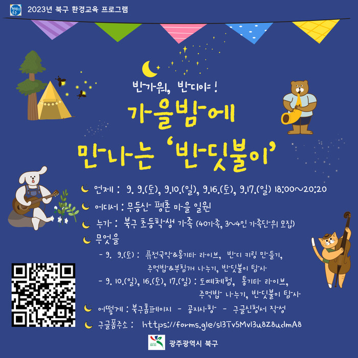 북구는 먼저 오는 9일부터 17일까지 회당 50여 명의 가족 단위 주민을 대상으로 ‘가을밤에 만나는 반딧불이 행사’를 4회 운영하여 통기타 공연, 환경 퀴즈 풀이, 반딧불이 탐사 등 주민들이 즐길 수 있는 다채로운 프로그램을 제공할 계획이다.