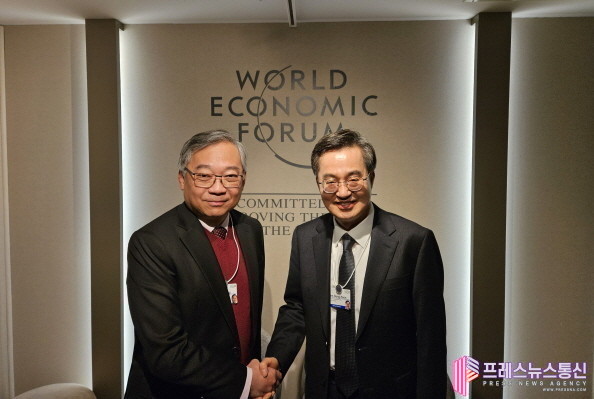 | ▲21일 오후(현지시간) 김동연 경기도지사가 스위스 다보스 콩그레스 센터에서 간킴용 싱가포르 부총리와 면담을 하고 있다.(사진=경기도) |