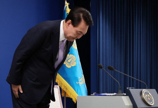 | ▲윤 대통령이 지난 7일 서울 용산 대통령실 청사 브리핑실에서 열린 대국민담화 및 기자회견에 앞서 사과하며 고개를 숙이고 있다.(사진= 뉴스1) |