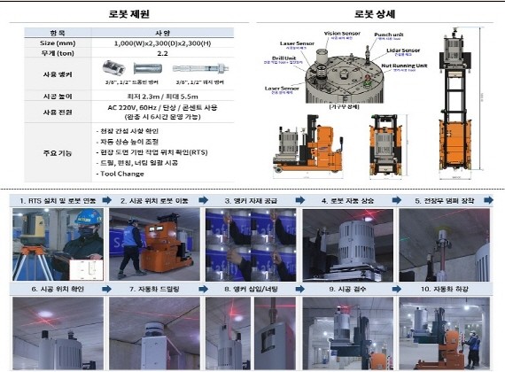 단지·주택 분야는 삼성물산㈜, 대명GEC의 ‘건설용 앵커 설치 실용화 로봇’이 수상했다. 드릴링·펀칭·너팅 등 앵커 설치 전공정을 자동화한 앵커 설치 로봇 개발을 통해 고소·반복 작업의 안전성 및 시공 품질·생산성을 확보했다. 또, 고소 작업인력 투입 감소 및 기술인 근골격계 질환을 예방하는 한편, 균일한 고품질 시공으로 품질 저하로 인한 앵커 낙하를 방지하고, 기존 인력 시공 대비 최대 133%의 생산성을 증가했다.