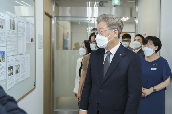 ▲ 19일 오전 경기도인재개발원 도서관동 3층 소재 경기도 디지털성범죄 피해자 원스톱 지원센터를 방문한 이재명 경기도지사가 센터 시설을 둘러보고 있다.(사진=경기도) |