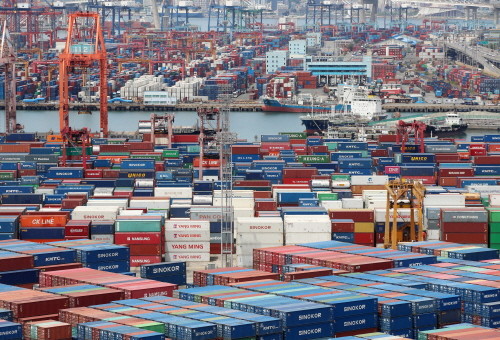 ▲11일 부산항 신선대부두와 감만부두 야적장에 컨테이너가 가득 쌓여 있다.(사진= 뉴스1) |
