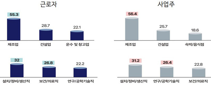 구체적으로 ‘어떤 분야에 연장근로 관리단위 개편이 필요한가’를 묻는 질문에 대해, 업종의 경우 제조업과 건설업이 높았다. 직종에서는 설치·정비·생산직, 보건·의료직, 연구·공학 기술직에서 개편이 필요하다는 응답 비율이 노사 모두 높게 나타났다.
