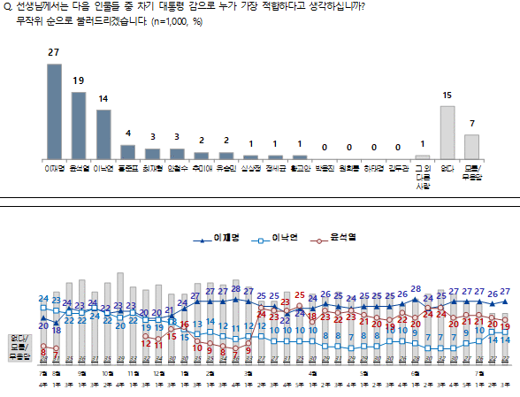 차기 대선후보 적합도 조사에서 이재명 지사는 27%, 윤 전 총장 19%, 이낙연 전 대표 14% 순으로 나타났다.