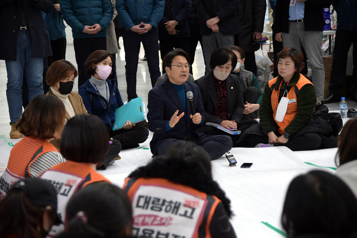 | ▲강기정 광주광역시장이 16일 대체보육교사들과 만나 고용문제 등에 대해 대화를 나누고 있다./광주광역시 제공 |