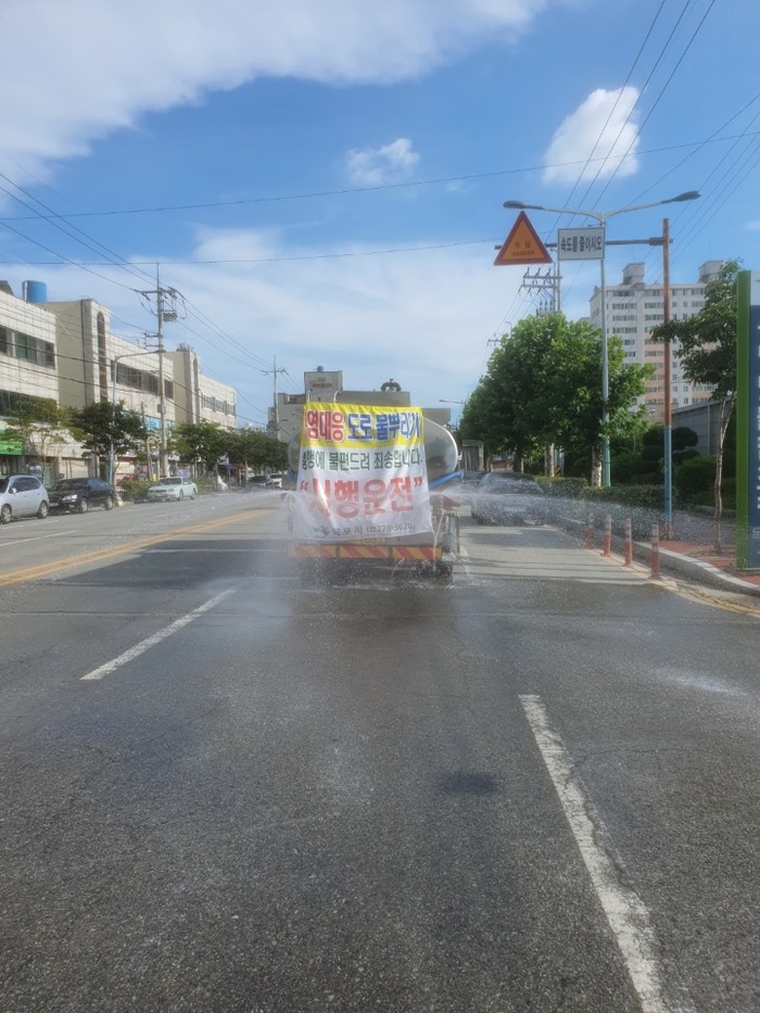| ▲폭염특보시 살수차를 통한 상가 및 주택 밀집지역 및 간선도로 물 뿌리기 (목포시 제공) |