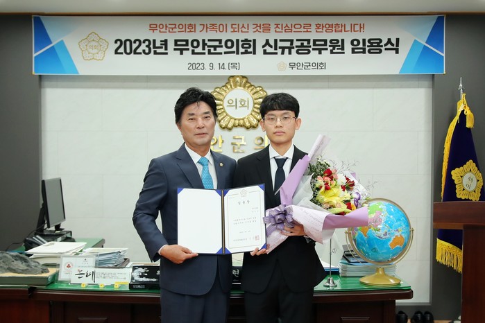 [전남=프레스뉴스] 강래성 기자= 무안군의회(의장 김경현)는 14일 오전 10시 의장실에서 ‘2023년도 무안군의회 신규 공무원 임용식’을 열고 신규임용 공무원 1명(행정9급)에게 임용장을 수여했다.