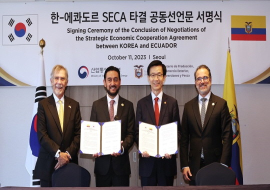 산업통상자원부는 11일 오전 서울 롯데호텔에서 방문규 장관과 다니엘 레가르다 에콰도르 생산통상투자수산부 장관이 SECA 협상 타결을 공표하는 공동선언문에 서명했다고 밝혔다.