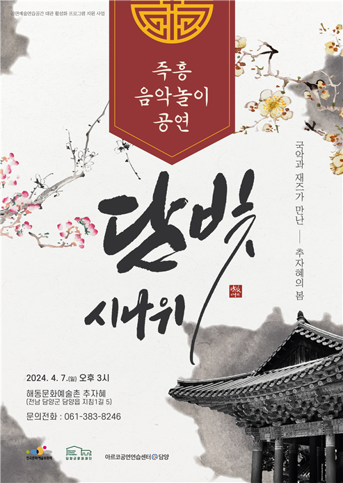 [전남=프레스뉴스] 박정철 기자=(재)담양군문화재단(이사장 이병노)에 따르면 공연예술연습공간 대관 활성화 프로그램 즉흥음악놀이 공연 ‘담빛 시나위’를 4월 7일 오후 3시 해동문화예술촌 추자혜에서 선보인다고 밝혔다.