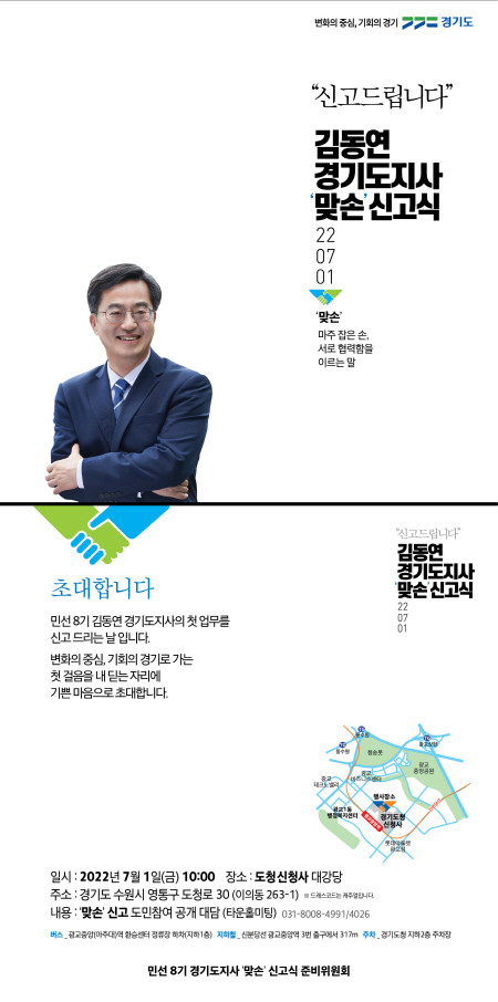 오전 10시에는 경기도청 대강당에서 맞손 신고식을 진행한다. 사회는 반호영 인수위 공동위원장이 맡는다. 행사는 도민과 소통하는 타운홀미팅과 일대일 프리토킹 방식으로 진행되며, 김 당선인은 도민의 의견을 경청할 예정이다.