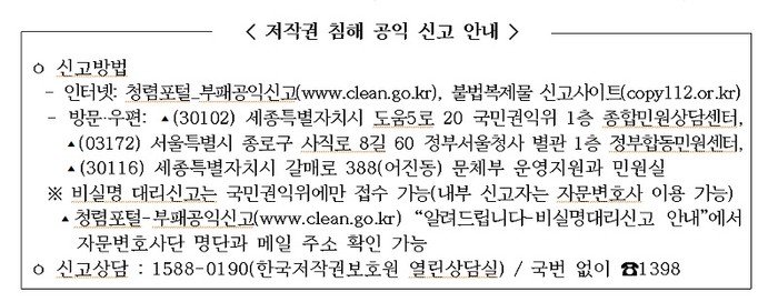 신고는 국민권익위 ‘청렴포털’ 누리집이나 한국저작권보호원 ‘불법복제물 신고’ 누리집을 통해 할 수 있으며 권익위·문체부 방문 신고나 우편 신고도 가능하다. 특히 신분 노출 우려에 대비해 변호사를 통한 비실명 대리신고도 할 수 있다.