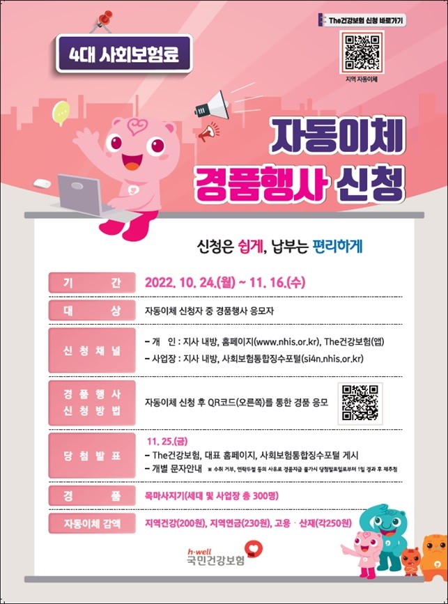 이번 경품행사는 10월 24일부터 11월 16일까지 진행되며 4대 사회보험료 자동이체를 신규 신청한 사업장과 지역가입자를 대상으로 총 300명을 추첨하여 목 마사지기를 지급한다.