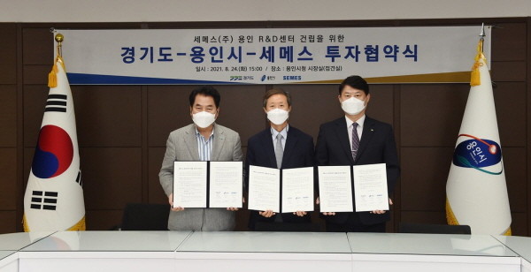 이한규 경기도 행정2부지사와 백군기 용인시장, 강창진 세메스(주) 대표이사는 24일 오후 용인시청에서 이런 내용을 담은 ‘세메스(주) 용인R&D센터 건립 투자유치 양해각서’를 체결했다.