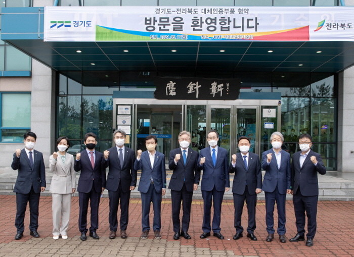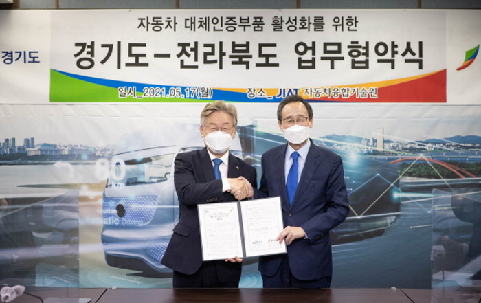 이재명 경기도지사와 송하진 전라북도지사는 17일 전북 군산에 위치한 자동차융합기술원(JIAT)에서 이런 내용을 담은 ‘자동차 대체인증부품 활성화 사업’의 상생 협력을 위한 업무협약을 체결했다.