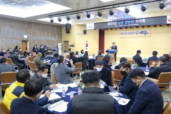 | ▲3일 열린 순천시 신년 언론인 브리핑에서 질문 받는 노관규 순천시장/순천시 제공 |
