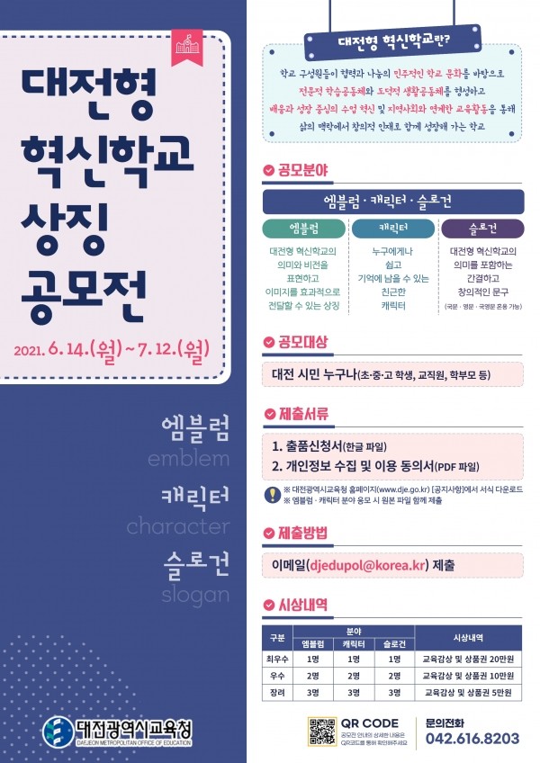 공모 분야는 대전형 혁신학교의 가치와 비전을 담은 엠블럼, 캐릭터, 슬로건 세 분야의 작품을 공모한다.