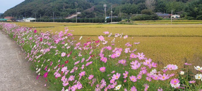 가을을 맞아 벼가 누렇게 익어가는 황금들녘과 그 옆을 흐르는 곤양천, 그리고 가을의 전령 코스모스가 함께 어울려 가을날의 정취를 만끽하게 한다.