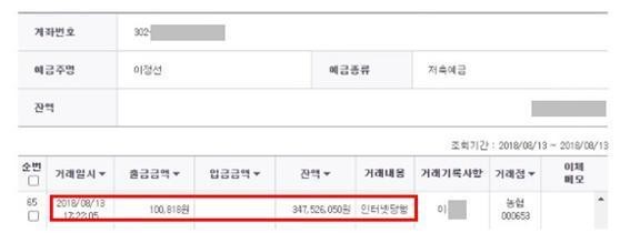 ▲ 2018년 이정선 후보 펀드계좌에 제보자 A씨 거래내역에 나온 동일시간 입금내역 확인 |