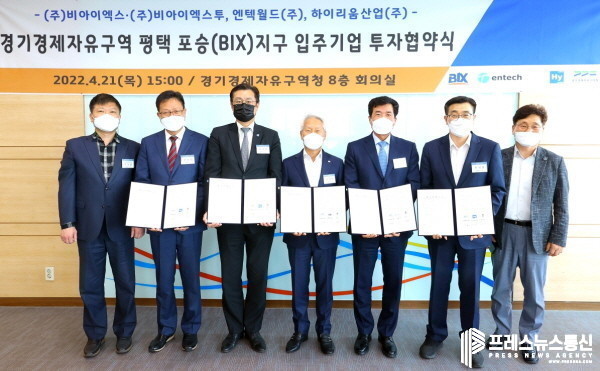 경기경제청은 21일 경제청 회의실에서 ㈜비아이엑스·㈜비아이엑스투, 엔텍월드㈜, 하이리움산업㈜, 평택시와 평택 포승(BIX)지구 물류·산업시설 용지 입주를 위한 투자협약을 체결했다.
