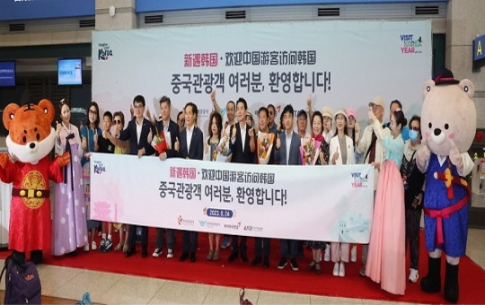 | ▲지난해 8월 24일 인천국제공항 입국장에서 한중수교 31주년을 기념하는 중국인 단체 환대 행사에서 중국인 단체 관광객들이 참석해 포토타임을 갖고 있다. (사진=국민소통실) |