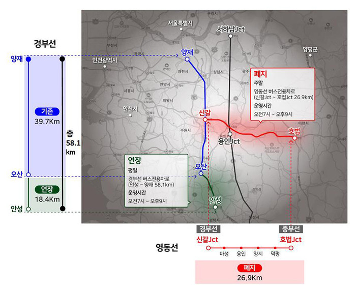 아울러 현재 토요일·공휴일 신갈분기점부터 호법분기점까지 운영 중인 영동선 버스전용차로는 다음 달 1일부터 폐지된다.