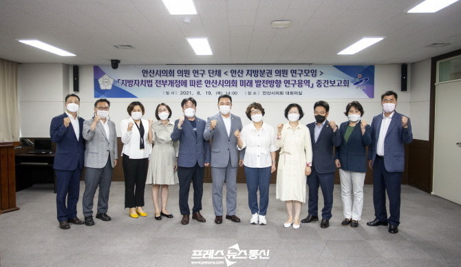 ▲ 의원연구단체들이 내놓은 결과물에도 시민들의 관심이 쏠렸다. 사진은 ‘안산 지방분권 의원 연구모임’이 2021년 8월 19일 의회 대회의실에서 ‘지방자치법 전부개정에 따른 안산시의회 미래 발전방향 연구용역 중간보고회’를 개최한 모습으로, 연구 단체들은 이러한 과정을 거쳐 깊이 있는 제안을 도출할 수 있었다.(사진=안산시의회) |