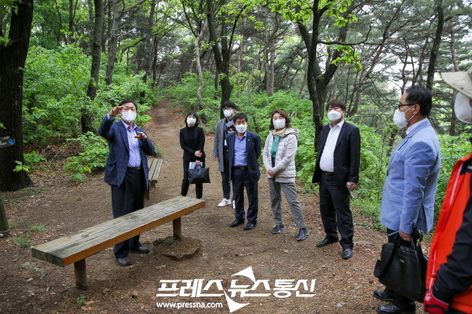 ▲ 의원연구단체들은 2021년 한해 동안 총 34회의 활동을 벌이며 정책 발굴 작업에 매진했다. 사진 속 ‘뿌리’ 소속 의원들이 지난해 4월 30일 일동 성태산성 일원에 대한 현장조사를 벌인 것도 그 일환이다.(사진=안산시의회) |
